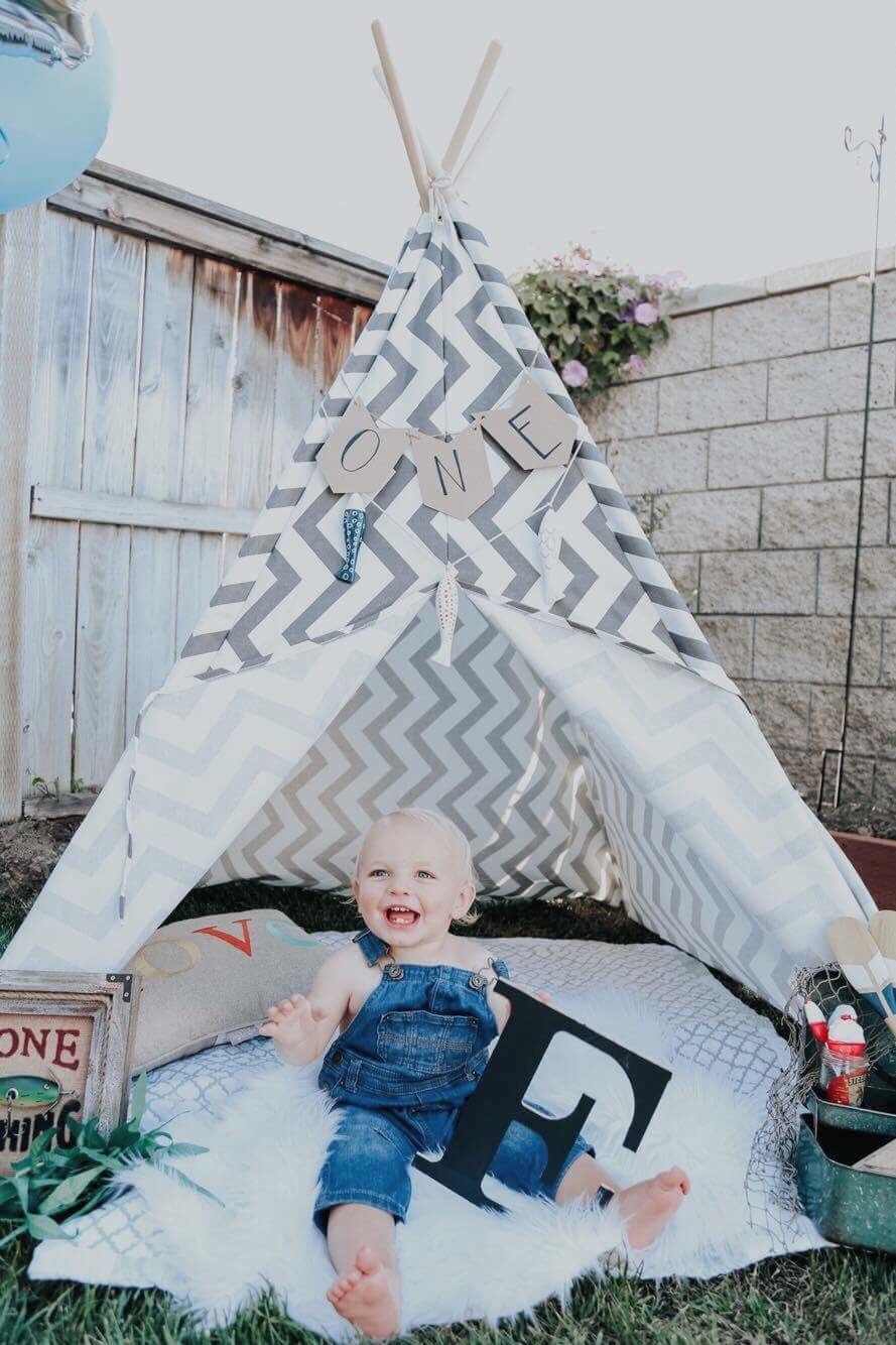 I added a cute shelf with some decor just to make the large wall seem less gigantic. I am still deciding whether or not I want to stain the shelf or leave it its natural wood. Hmmm, any thoughts? I found the perfect sign that said exactly what every mama feels about their baby. (Because, I am seriously going to love him forever and ever.) I added a cute little plant for a pop of color and the hanging sign to fill up some of that wall space. Plus, lets be honest, all he does is eat, sleep, play and repeat. Well, and cry. He does a lot of that too lately, lets be honest. I really do love how it all came together. It’s my favorite space. [Well, other than the teepee because that spot is the best!]
